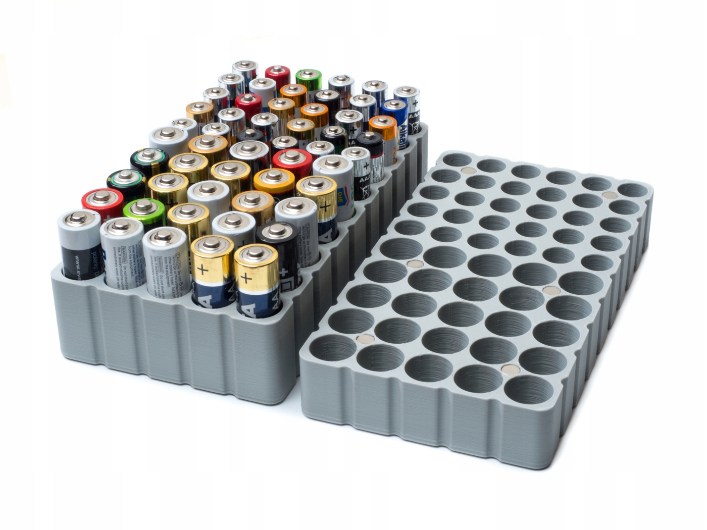 Производимый нами контейнер рассчитан на хранение 25 шт. элементов АА (LR6) и 30 шт. элементов ААА (LR3) б>. Он состоит из двух подобранных частей, оснащенных сильными неодимовыми магнитами, благодаря которым после соединения крышки с основанием коробка никогда не откроется сама по себе. Ваши аккумуляторы всегда будут в безопасности, даже во время транспортировки!