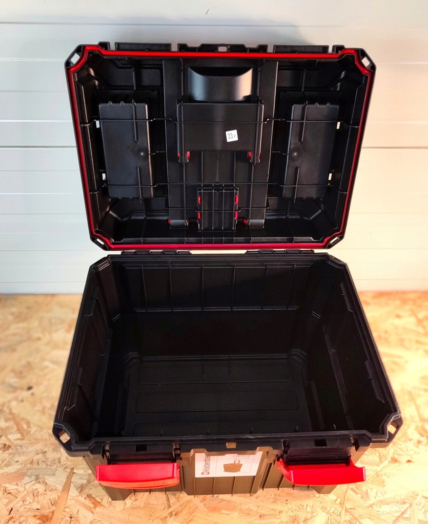 Ящик имеет 2 большие камеры; верхняя полка-корзина. Снаружи 2 закрытых органайзера с отделениями для шурупов и болтов.
