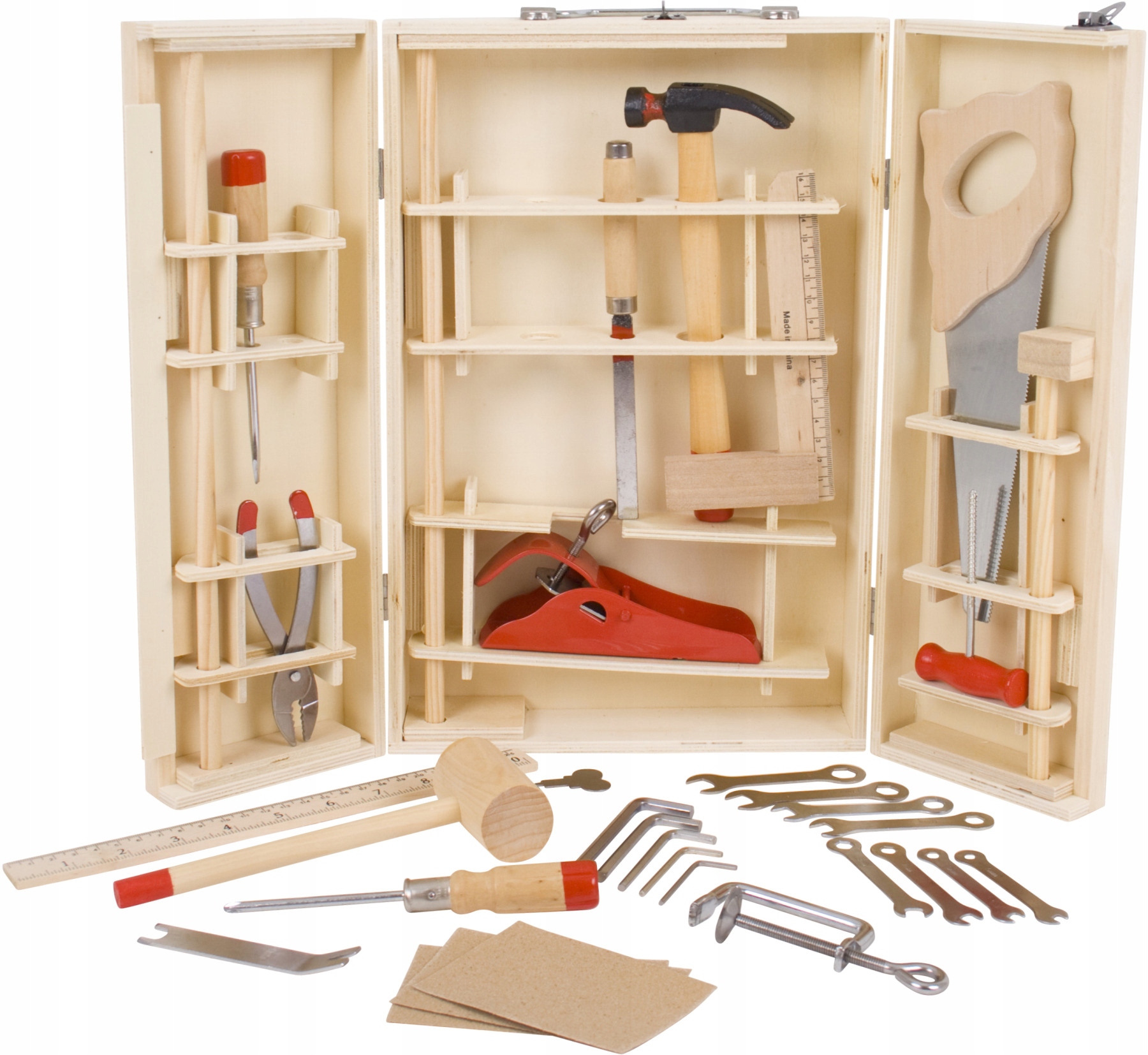 Этот прочный деревянный ящик, закрывающийся на защелку, содержит все, что нужно маленькому Бобу-строителю, в том числе: разные типы гаечных ключей, молотки, отвертки, деревянные рулетки, долото, плоскогубцы, пила, рубанк, зажим, наждачная бумага и еще несколько тщательно изготовленных инструменты - всего 28 штук!