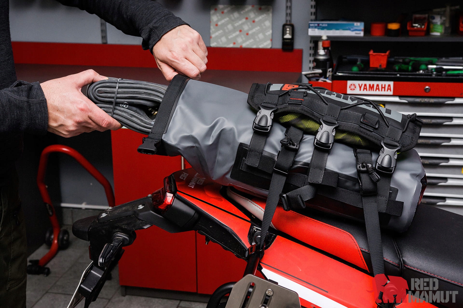 REDX RED MAMUT CENTRAL BAG - это самая маленькая центральная сумка RED MAMUT, доступная в двух вариантах вместимости: 20л и 12л (также есть в наличии в нашем магазине). Меньшая версия объемом 12 л идеальна в качестве ящика для инструментов, куда можно поместить запасные трубки, компрессор, ложки, непромокаемый набор, а любителям кофе в полевых условиях — они также возьмут с собой плиту и газовый баллончик. В версии объемом 20 л есть место для гамака и небольшого спального мешка, а также несколько порций сублимированной еды, поэтому вы можете отправиться на выходные на своем эндуро-мотоцикле и провести ночь в поле, имея всего одну сумку. Мы не предлагаем кофе, но предлагаем сублимированные продукты от LYOFOOD, а также варочные аппараты и картриджи! Мы приглашаем вас! Благодаря специальным ручкам сумку REDX можно дополнительно прикрепить к непромокаемой сумке объемом 3 л или, например, сумке для бутылок, особенно рекомендуем вариант с термовставкой, т.е. 2L THERMO !