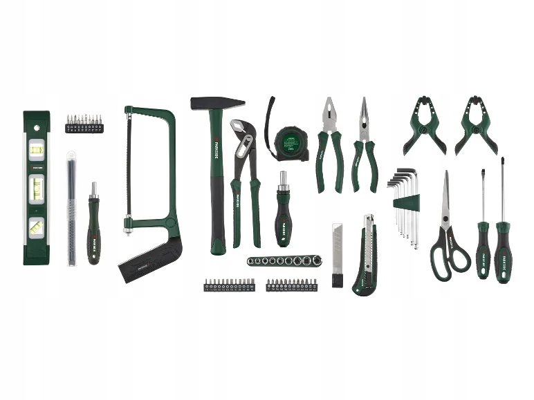 - Содержимое набора: 1x уровень, 10x бит (4 мм)1x прецизионный держатель бит 1 ножовка по ножовке 4 запасных пильных полотна 23 бита (6,3 мм) 1 адаптер с внутреннего квадрата 6,3 мм на внешний шестигранник 6,3 мм 1 нож для обоев 10 лезвий ножа для обоев 1 комбинированные плоскогубцы 1 слесарный молоток 1 гидравлические плоскогубцы 9 торцевых ключей 1 держатель бит с трещоткой 1 прецизионные плоскогубцы 1 мерная лента (3 м) 2 зажима (55 мм) 8 шестигранных ключей с шариком 1 ножницы, 2 отвертки.