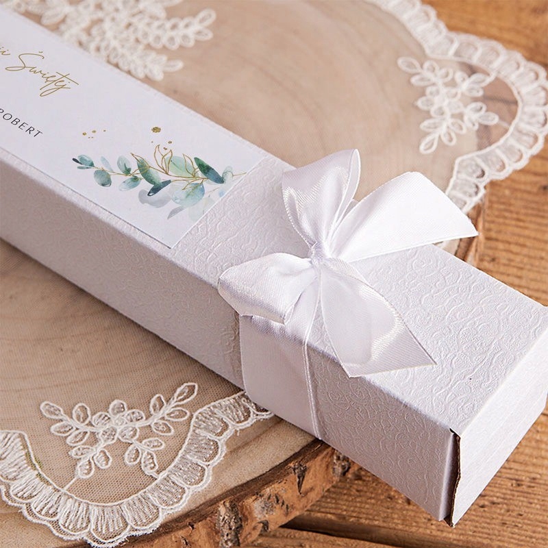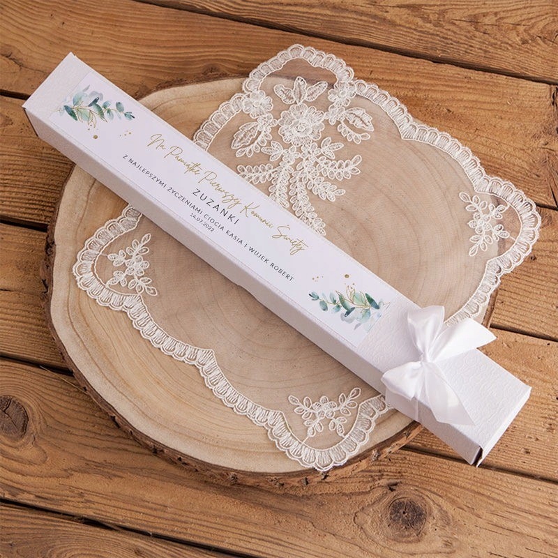 Картонная коробка для свечи для Причастия С ИМЕНЕМ Эвкалиптовая ветка (+белая лента)