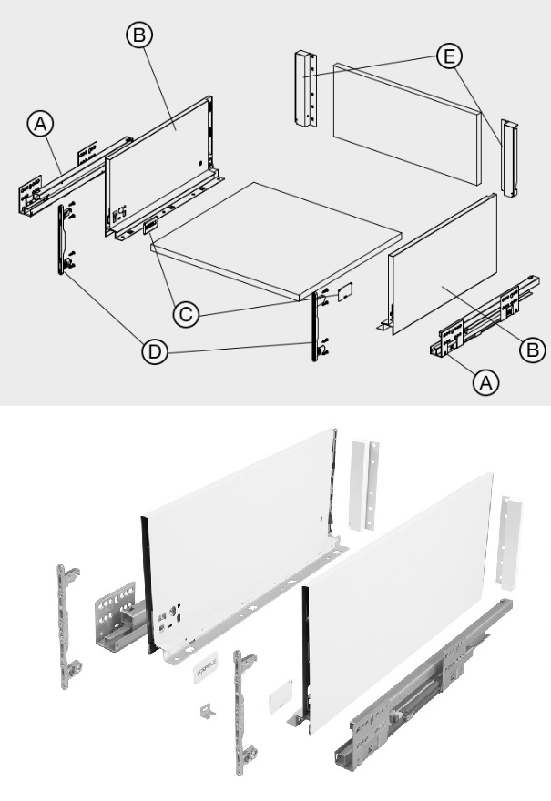 Комплект состоит из белых металлических боков и набора направляющих полного выдвижения. Нижняя и задняя стенки ящика должны быть изготовлены самостоятельно. Преимущество состоит в том, что размеры дна и задней части, а также отверстий спереди и сбоку мебели идентичны размерам ящиков Blum Tandem Box или GTV Axis Pro.