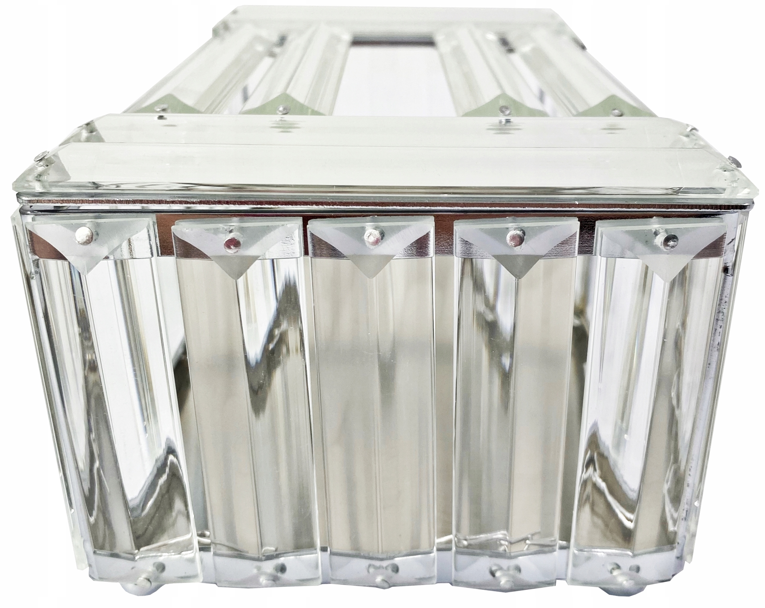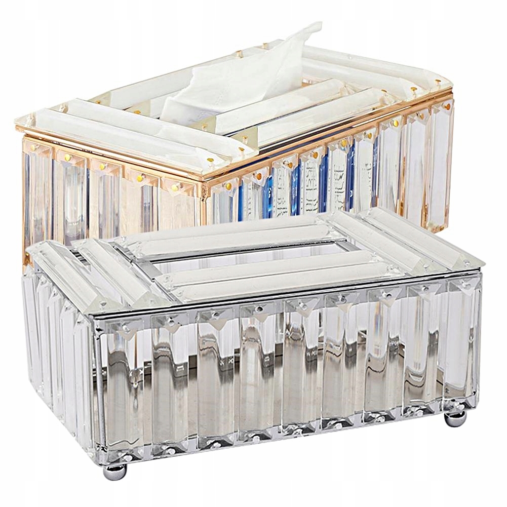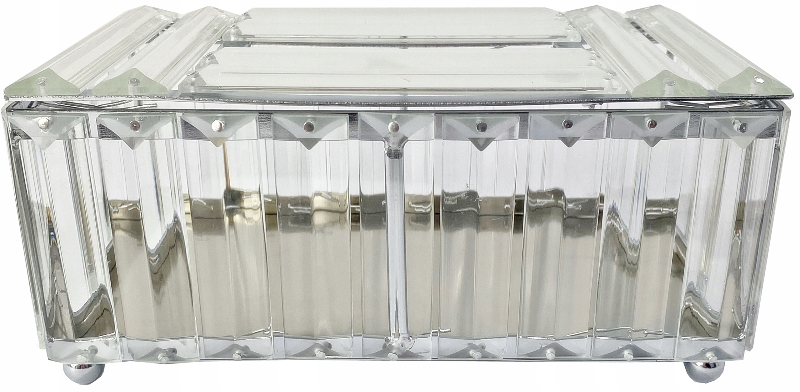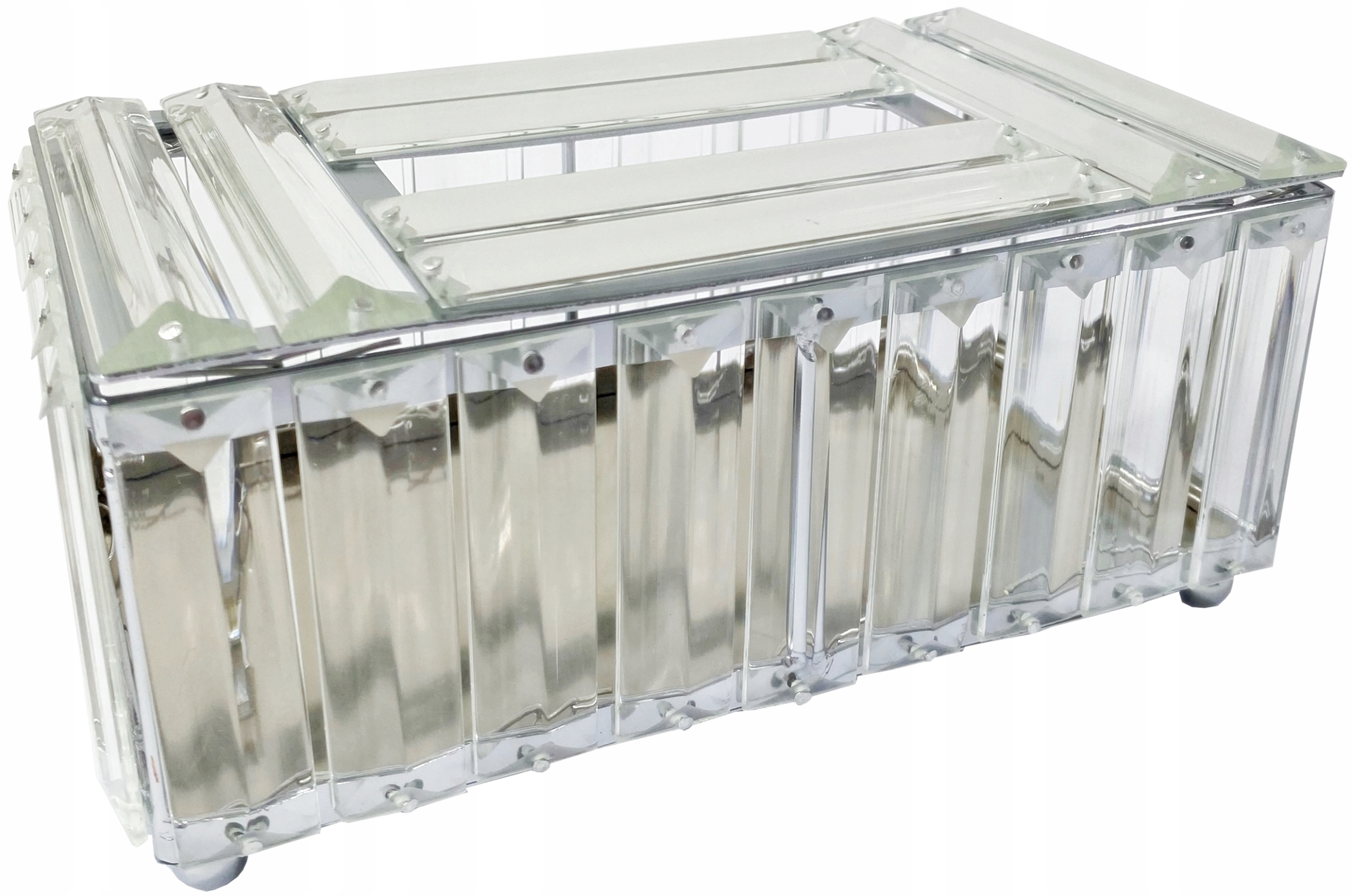 Коробка для салфеток с кристаллами по бокам и сверху. Дно контейнера металлическое, дополнено четырьмя круглыми подставками для ног. Отверстие прямоугольное.