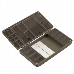 Это компактная последняя система хранения крючков в жестком футляре с магнитной фиксацией. с клапаном и мягкой тактильной обложкой, нескользящим внешним покрытием и оснащена линейкой для удобства завязывания. С одной стороны имеется открытое отделение, которое можно использовать для хранения более крупных предметов, таких как лески для плетения, инструменты Pulla Rig Toolz и ножницы. В той же секции TackleSafe расположены восемь отделений, закрывающихся клапаном с защелкой, чтобы гарантировать, что содержащиеся в них предметы не могут случайно высыпаться во время транспортировки - они идеально подходят для таких вещей, как бусинки Heli-Safe, гибридные зажимы для свинцов и подделки. Еда. На другой стороне TackleSafe расположены два больших отделения с крышками, в которых можно хранить крючки или иглы. Пенал также имеет множество закрытых и неглубоких отделений меньшего размера, которые можно использовать для хранения вертлюгов, колец для оснастки, термоусадочных трубок, кикеров и других мелких предметов.