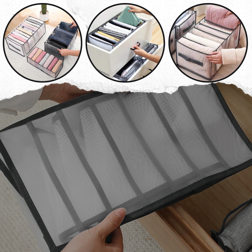 - Отделения: Универсальный органайзер для одежды имеет 7отделений, поэтому вы можете спрятать различные типы одежды, например, носков, нижнего белья, футболок, брюк и т. д. Благодаря тому, что она прозрачная, легко найти необходимый предмет одежды.