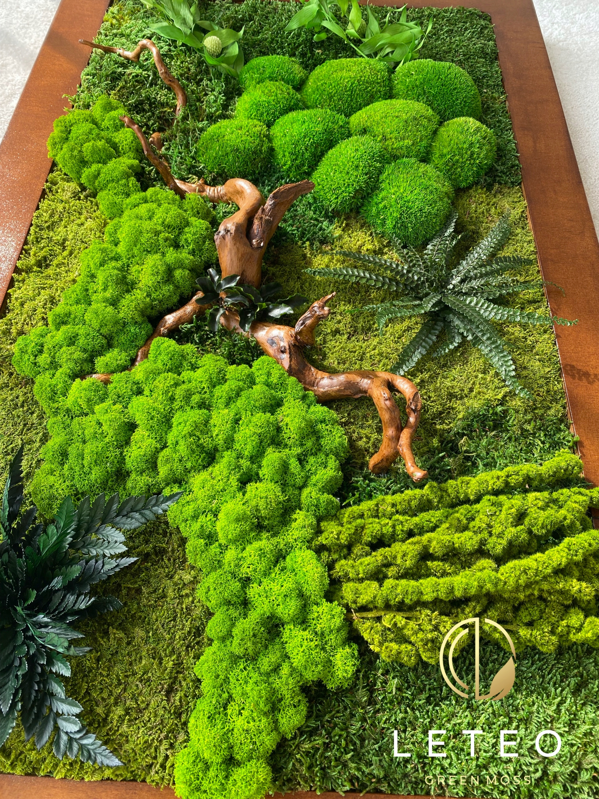 НАТУРАЛЬНЫЙ образ, созданный вручную из плоского мха, подушковидного мха, мха и стабилизированных растений, все подчеркнуто натуральным корнем, вырезанным речным течением.