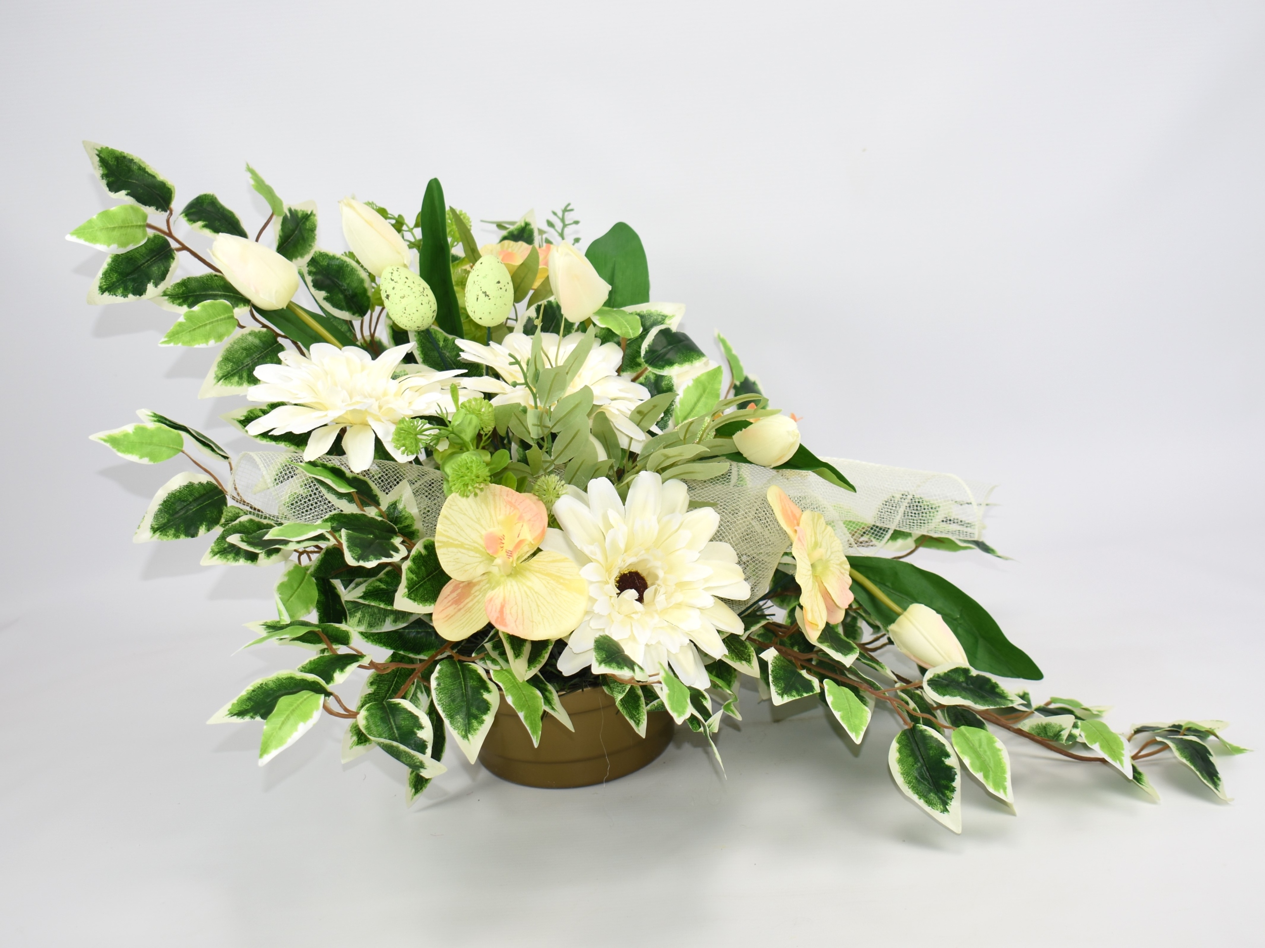 Представляем уникальное пасхальное украшение для могил, отличающееся эффектной композицией с крупными цветами, размещенными в центре.