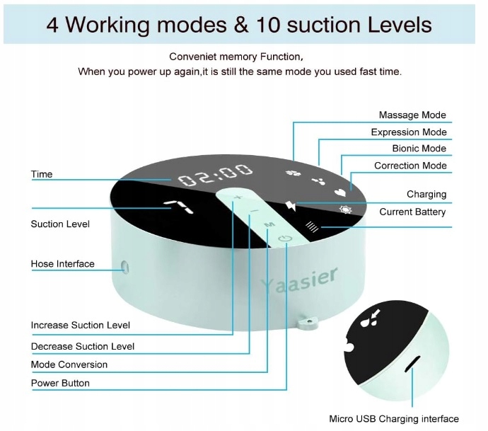 Высокая производительность: 4 режима эксплуатации и 10 градусов всасывания. 4 режима: массаж, сжатие, бионика и коррекция. Каждый режим имеет 10 различных уровней всасывания. 40 режимов, вы всегда найдете тот, который подходит вам лучше всего. Продукт оснащен светодиодным сенсорным экраном. Просто нажмите на свет, чтобы управлять устройством