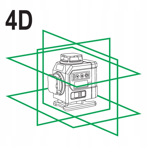 Самовыравнивающийся четырехплоскостной 4D-лазер в мини-версии с зеленым лучом. Он отображает 16 линий одновременно, что в общей сложности создает четыре плоскости по 360 градусов каждая (две горизонтальные и две вертикальные). Это позволяет одновременно получить две горизонтальные линии и одну вертикальную линию на каждой стене.