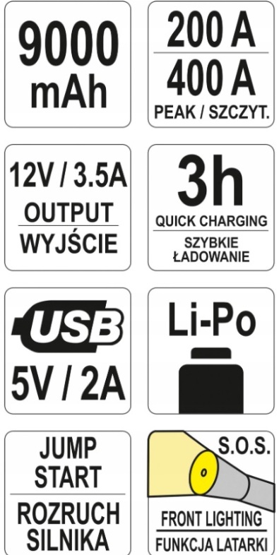 - 🔌 быстрая зарядка Powerbank - из сети 230 В в 3 часа или непосредственно от зажигалки автомобиля.