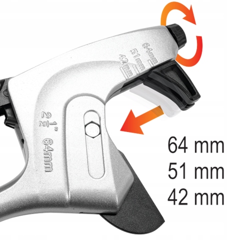 Регулируемый кронштейн, расположенный в конце лезвия, помогает позиционировать трубы диаметрами 40, 50 и 64 мм, , что повышает эффективность резки