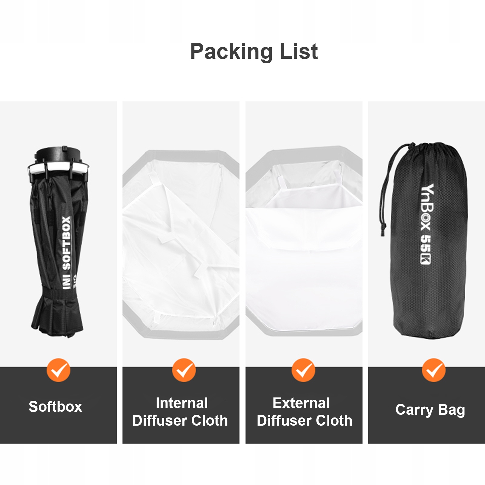 Функция: 1. 55 см/ 22 -дюймовый восьмиугольный Softbox, предназначенный для студийной лампы Bess с монтированием Bowens и светодиодными видео лампами, такими как видео -лампа Yongnuo Ynlux100/ Ynlux100 Pro.