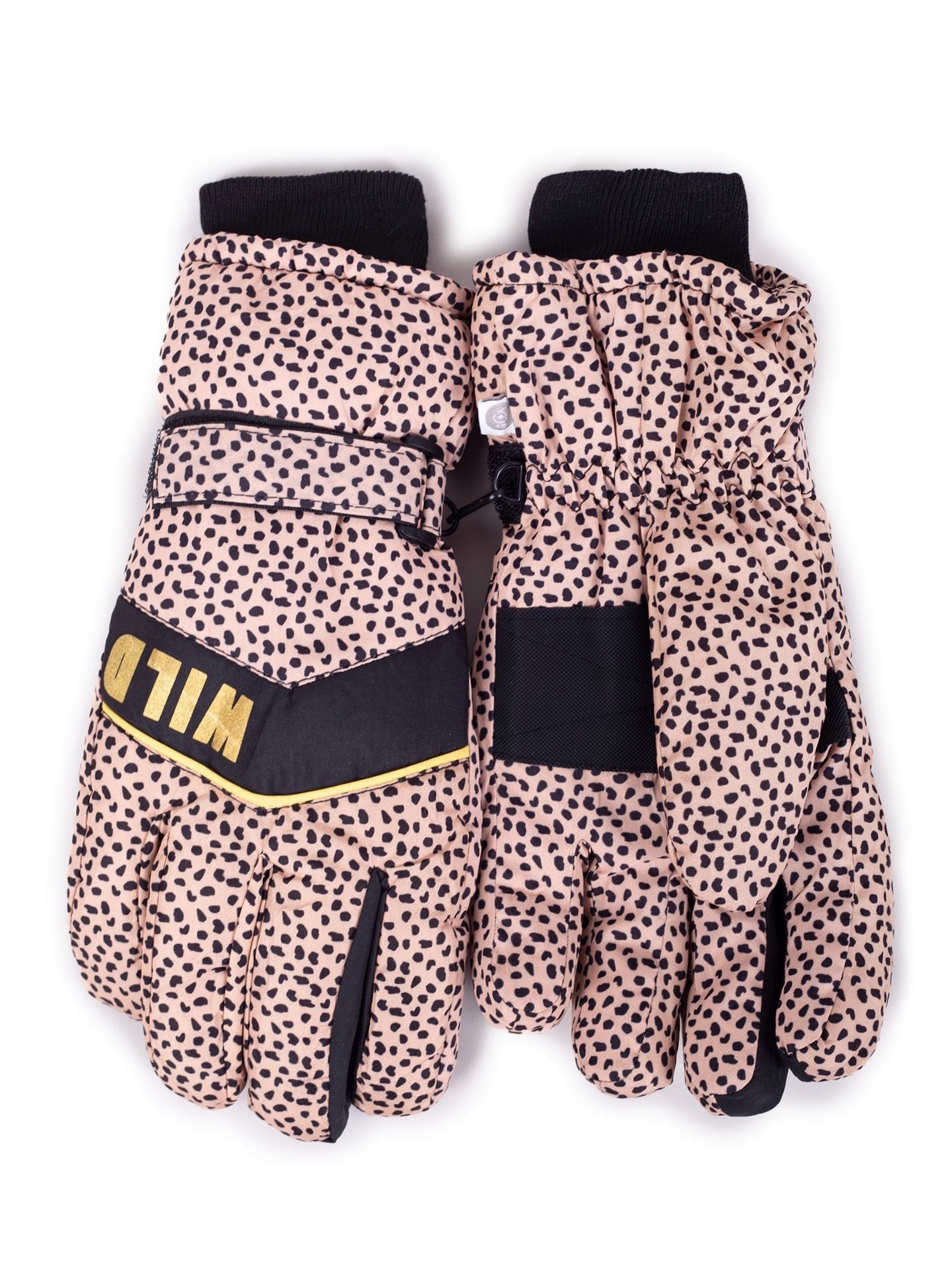 Молодежные лыжные перчатки < б>бежевыйс леопардовым принтом. Украшен золотой надписью: WILD. Внутренняя часть перчатки отделана красивым флисом.