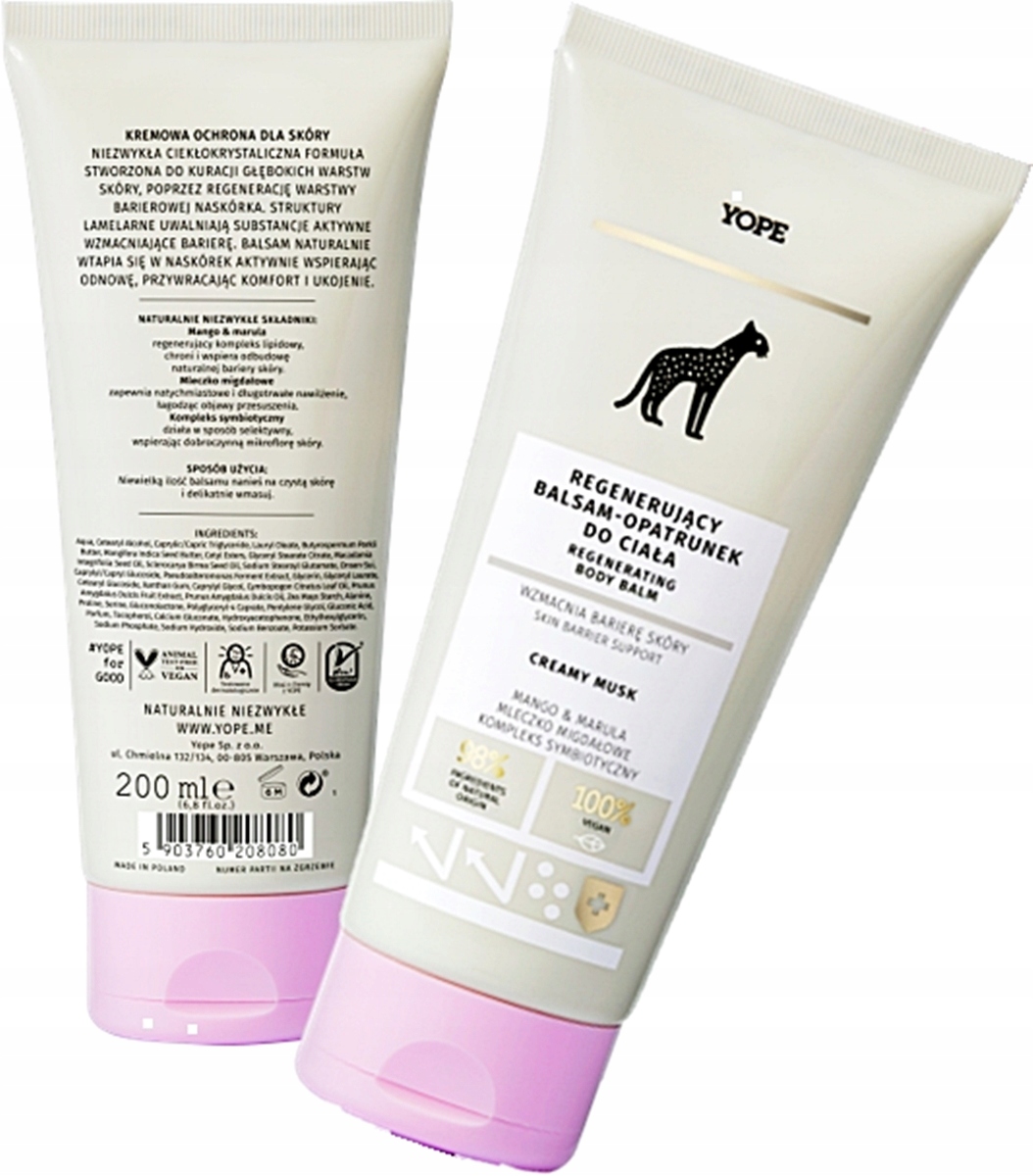 Регенерирующий лосьон для тела Yope Creamy Musk, который действует как повязка, защищая и укрепляя кожный барьер. Его жидкокристаллическая формула предназначена для лечения глубоких слоев кожи путем регенерации барьерного слоя эпидермиса. Ламеллярные структуры выделяют активные вещества, укрепляющие барьер. Бальзам естественным образом тает в эпидермисе, активно поддерживая регенерацию, возвращая комфорт и рельеф.