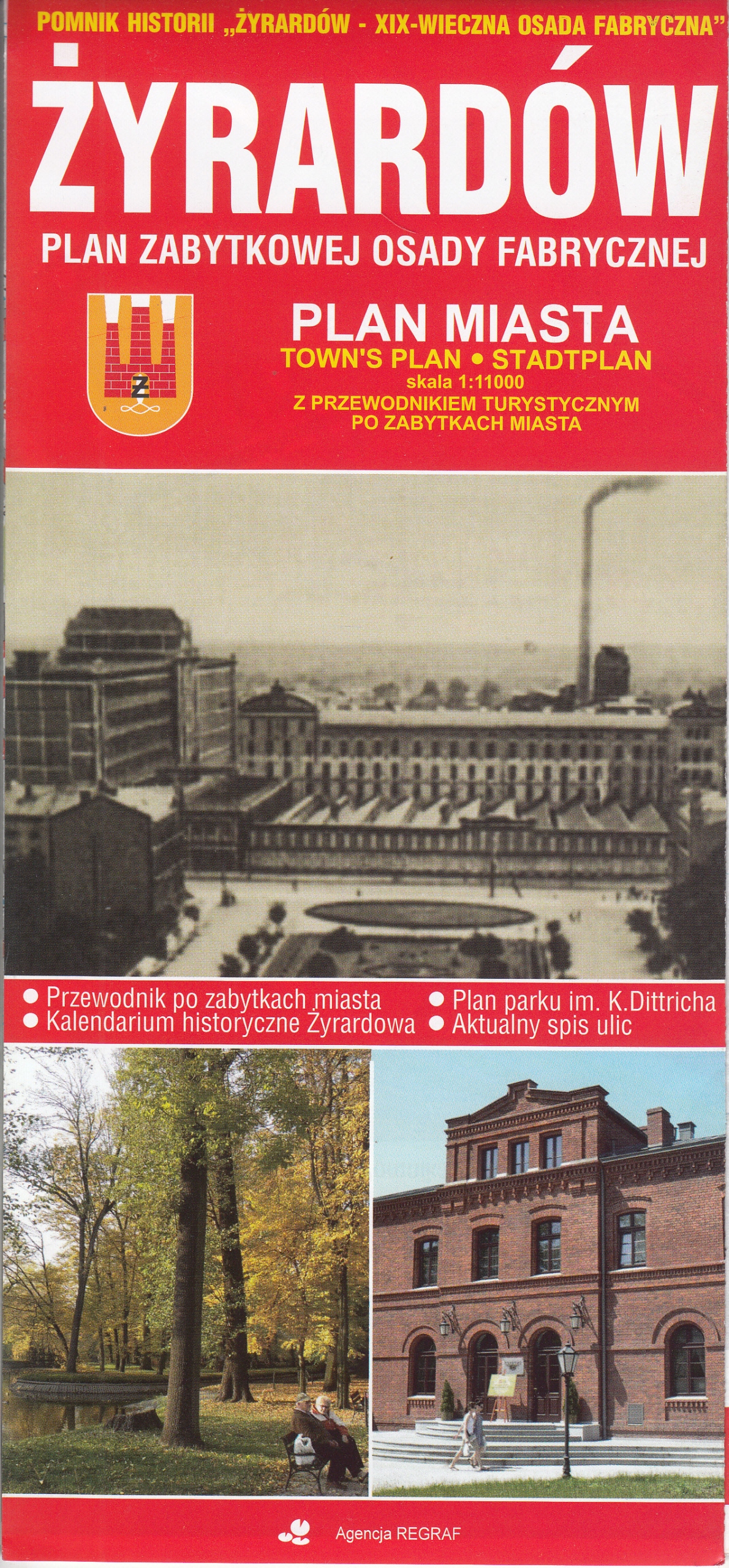 План города Жирардо. Zawier:- Точный план żyrardów вместе с планом нумерации зданий и общественного транспорта- Мини-дизиборист и загарной информации о историческом календаре города после завода- План поселения 19-го века и парка Карола Августа Диттрих- Важные телефоны и адреса