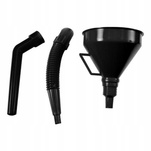 Воронка трехсекционная с сетчатым фильтром для топлива, масла и других рабочих жидкостей. Оснащен двумя сменными насадками (одна гибкая, другая жесткая, изогнутая под углом 50°) для облегчения заливки. Широко используется в гаражах, мастерских и автосервисах.
