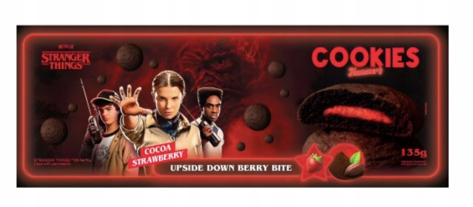 Ограниченная серия печенья «Очень странные дела» — печенье из темного какао с ярко-клубничной начинкой, вдохновленное миром сериала «Вверх тормашками». Идеально подходит для совместного просмотра во время просмотра сериалов или в качестве сладкого перекуса для поклонников поп-культуры.