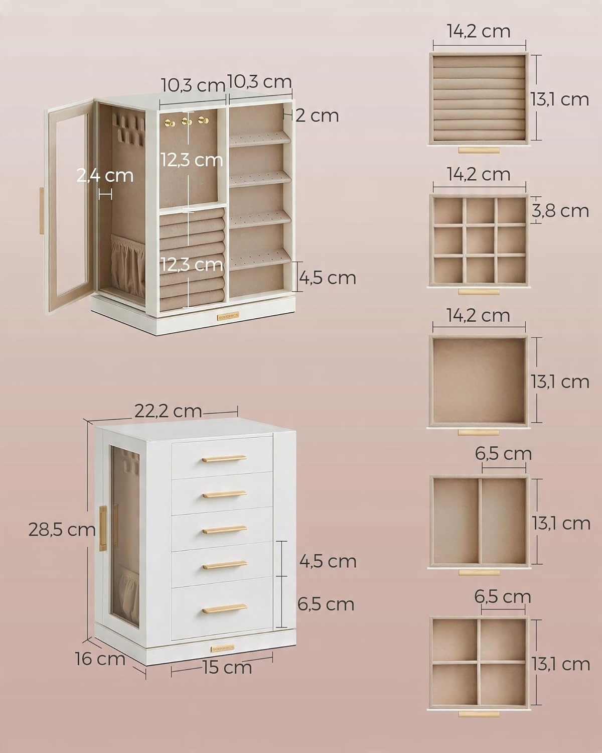 - Одна сторона с открытым доступом к украшениям ( 7 отсеков для колец , 3 ручки браслетов , 48 мест для серьги - 24 для висящих серьс и 24 для серьги палки)
