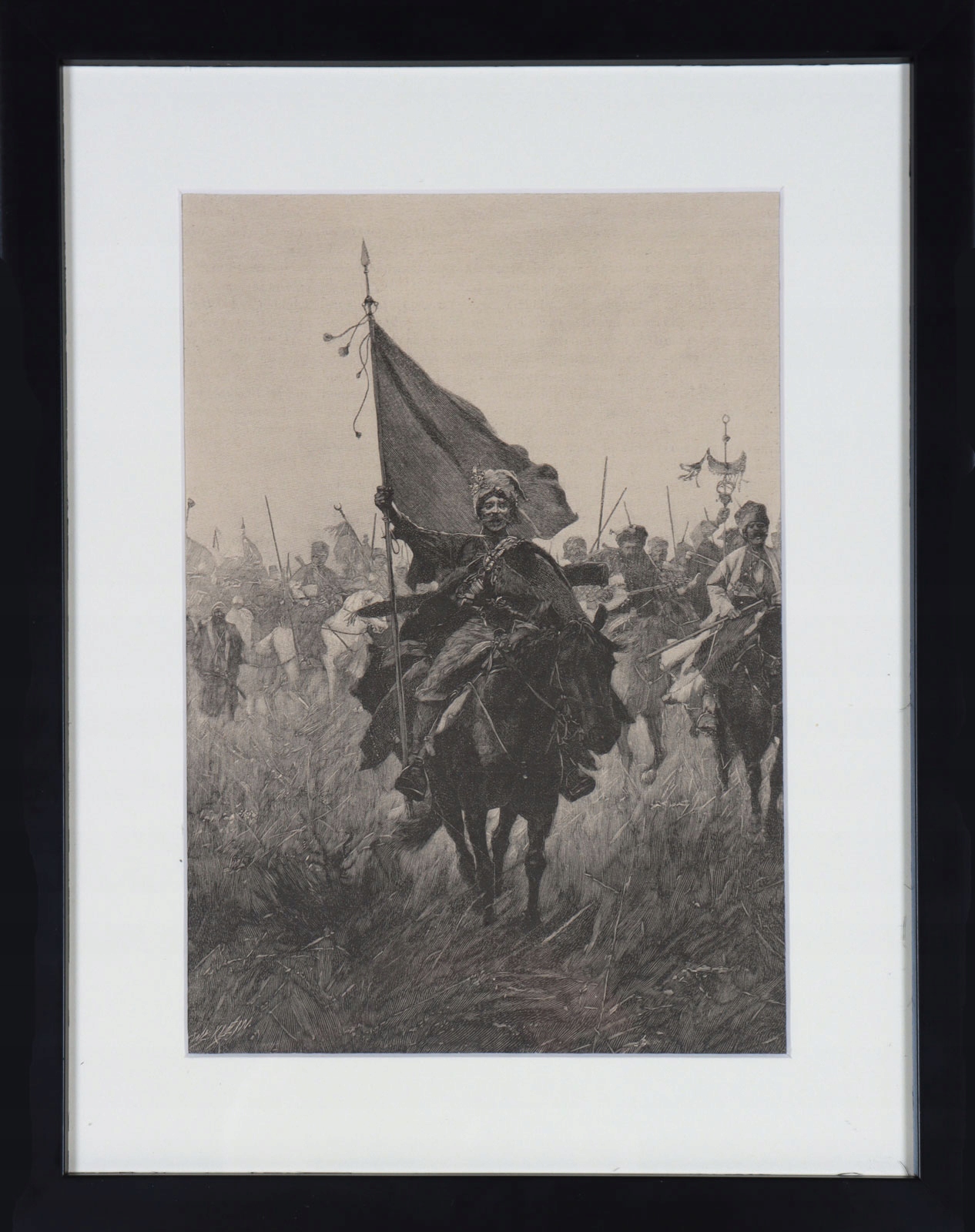 На графике изображен отряд казаков, возвращающихся после боя.