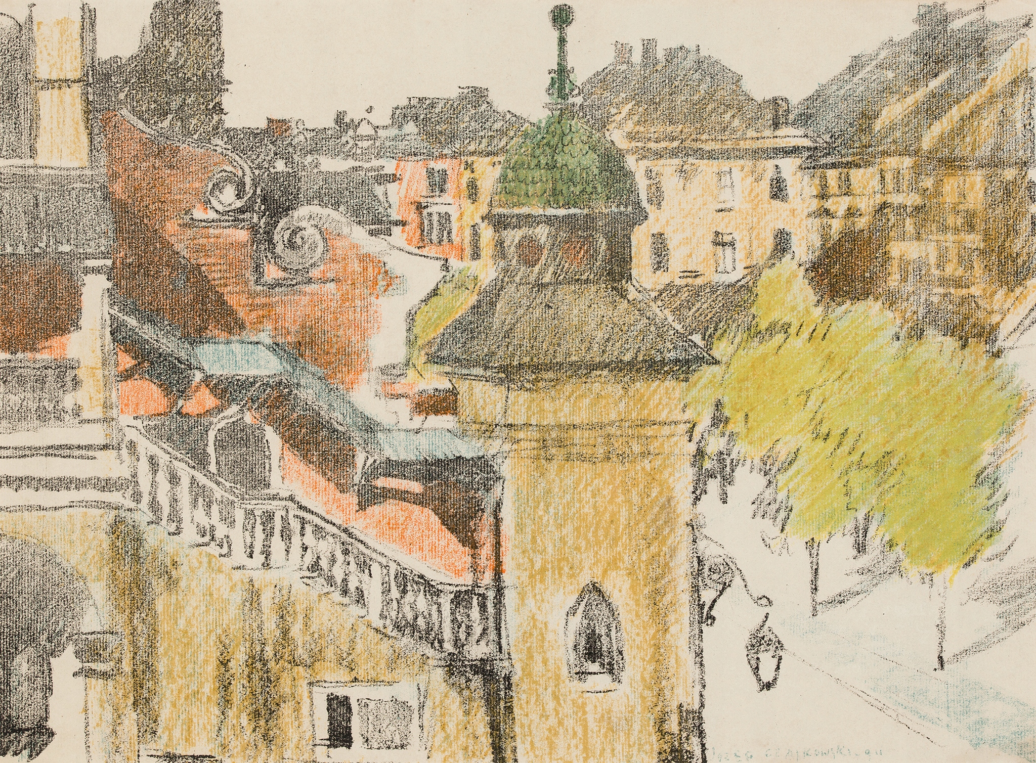Аутентичная работа известного краковского живописца и графика Юзефа Чайковского, представляющая фрагмент архитектуры Главной площади Кракова. На переднем плане фрагмент боковой стены Суконных рядов, вид со стороны улицы Брачка. На заднем плане чуть сверху увековечены деревья и доходные дома Главной площади.