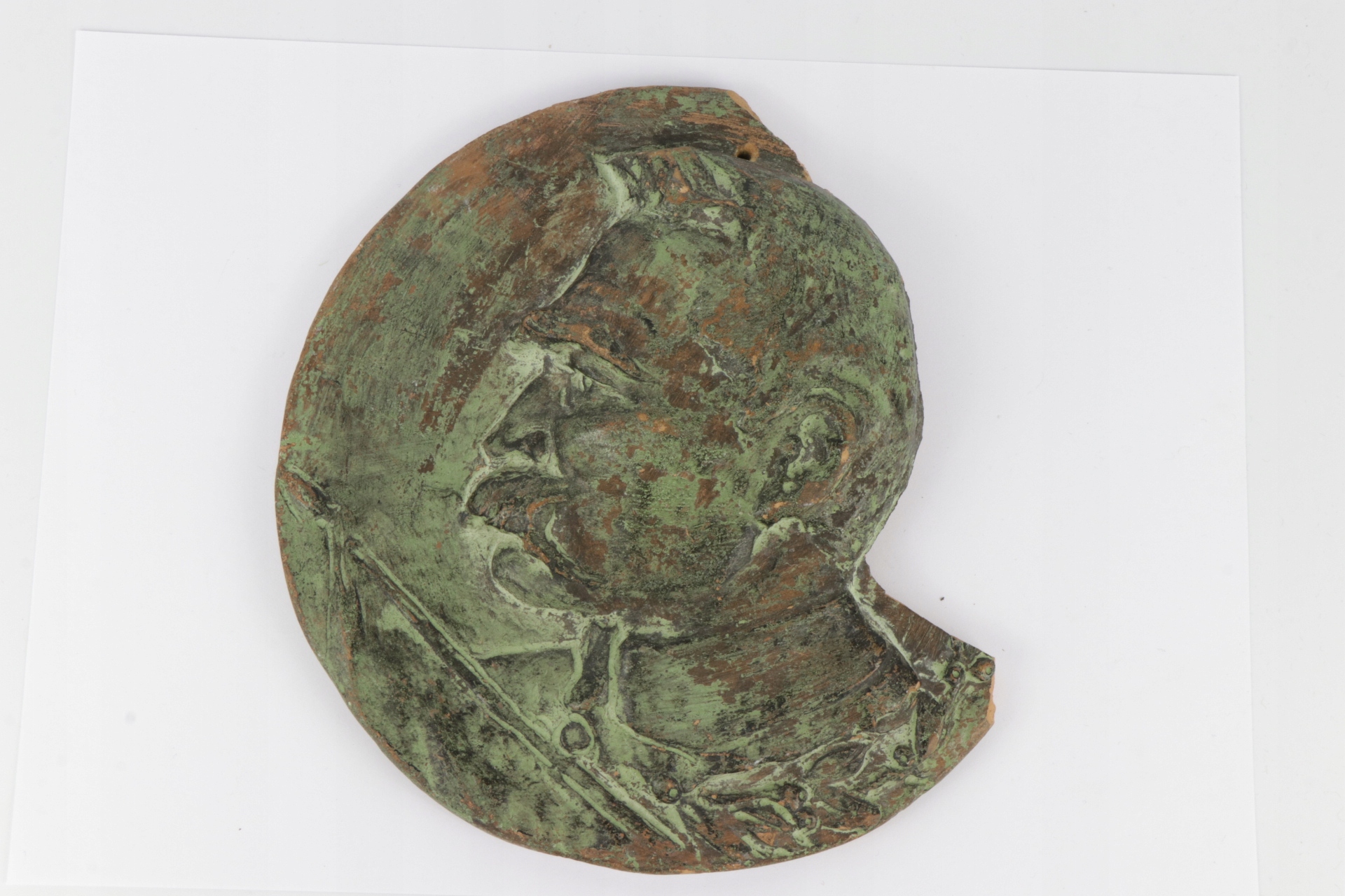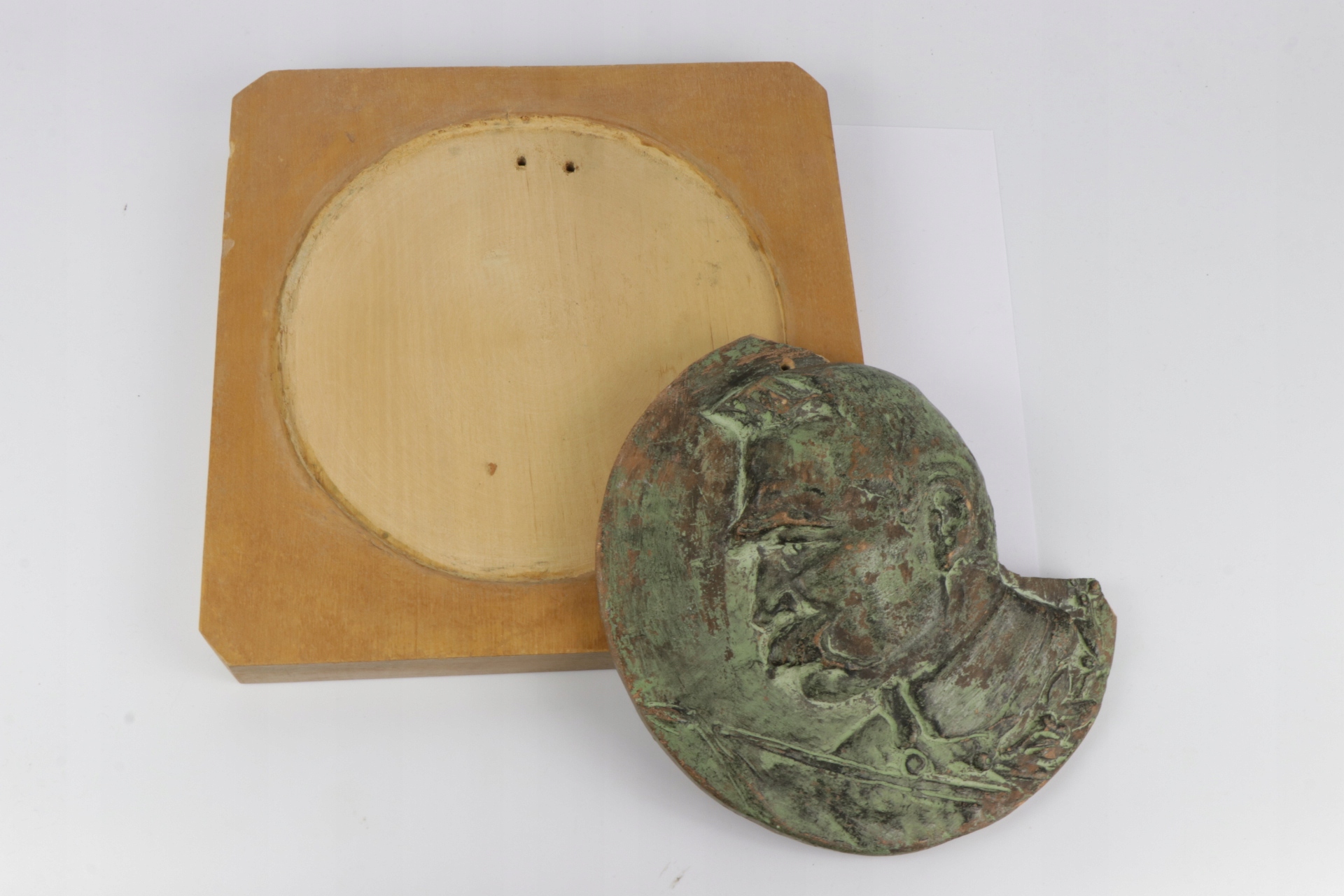 Интересная старинная терракотовая доска с изображением маршала Юзефа Пилсудского. Терракота свободно закреплена на деревянной резной доске.