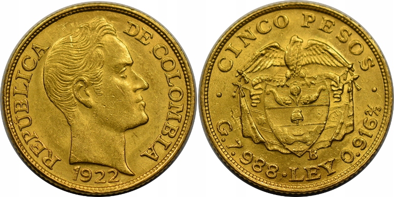 Z8.КОЛУМБІЯ 5 ПЕСОС 1922 СТАН ЗОЛОТА: I
