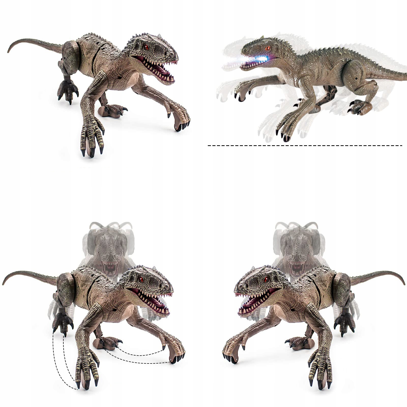 Совместная конструкция позволяет голове и хвосту динозавра качаться. При нажатии кнопки велоцираптор с дистанционным управлением поднимает ноги, позволяя ему ходить как настоящий динозавр, в отличие от других шкивов. Гибкая конструкция действий позволит вашему ребенку почувствовать себя настоящим велоцираптором.