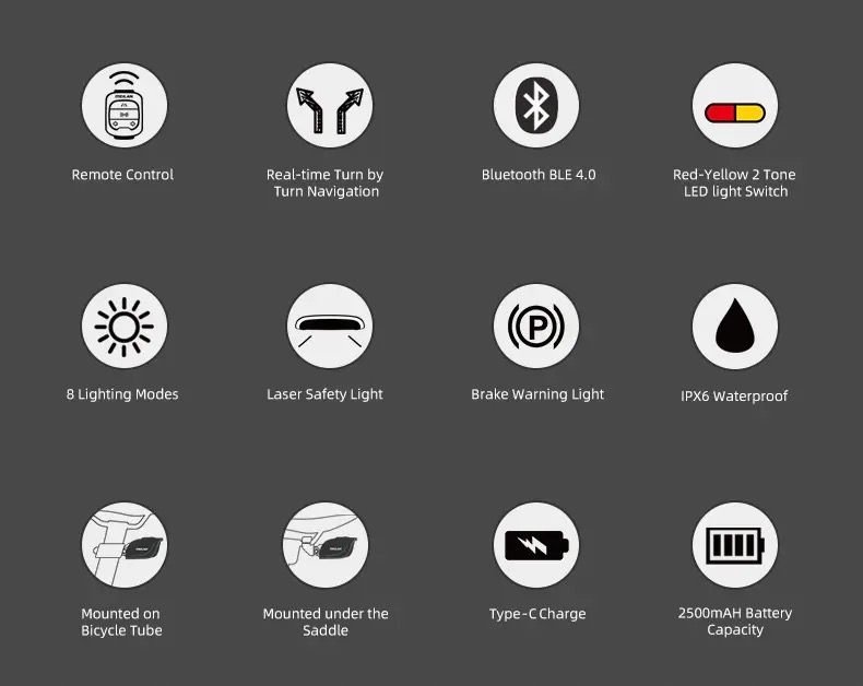 Может работать с Meilan M1 Finder и счетчиком Orbit, а также с приложением Komoot (подключение Bluetooth). Благодаря этому он автоматически включит поворотники в нужном направлении исходя из маршрута, запланированного в Комоот.