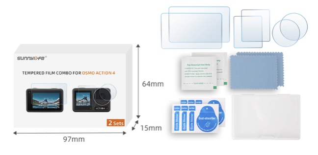 Если вы часто используете камеру OSMO Action 3 на открытом воздухе, убедитесь, что вы правильно защитили объектив и экран устройства. Закаленное стекло Sunnylife с твердостью 9H идеально подходит к устройству и обеспечивает эффективную защиту от царапин и трещин. Они гарантируют пропускание до 99%, так что вам понравится< б>высокое качество фото/видео и идеальная цветопередача. Изделия устойчивы к пыли, пятнам и отпечаткам пальцев. В комплект входят 2 пылепоглотителя, 2 салфетки и 2 марли, на 70% пропитанные изопропиловым спиртом. Наслаждайтесь высоким уровнем защиты и эстетичным внешним видом с набором Sunnylife! р>