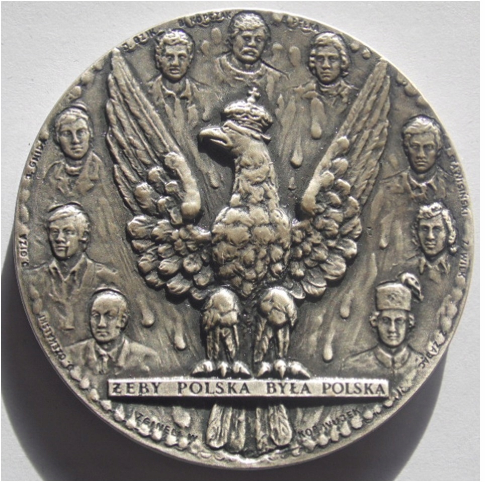 Реверс: Стоит коронованный орел на полосе с надписью MAY POLSKA Be POLAND, вокруг капель крови и девяти бюстов с именами