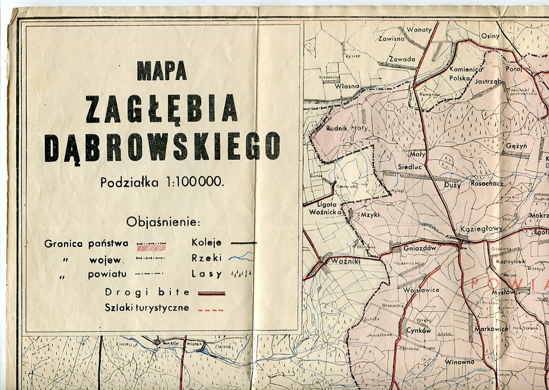 ::: на сканах показаны участки продаваемой карты --- города на карте включают: КАТОВИЦЕ, СОСНОВЕЦ, БЕДЗИН, ДЕМБРОВА ГОРНИЦА, ЗАВЕРЦЕ, МЫШКОВ, СЛАВКОВ, ОЛЬКУШ, ВОЛЬБРОМ и небольшие города - дороги обозначены, дороги, железнодорожные пути, леса, луга, болота, каналы и т. д.