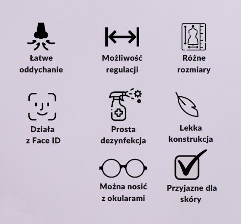 Изделие соответствует требованиям постановления министра здравоохранения о прикрытии носа и рта. Это обеспечит вам базовую защиту от загрязнений, осколков и ограничит передачу инфекционных агентов.