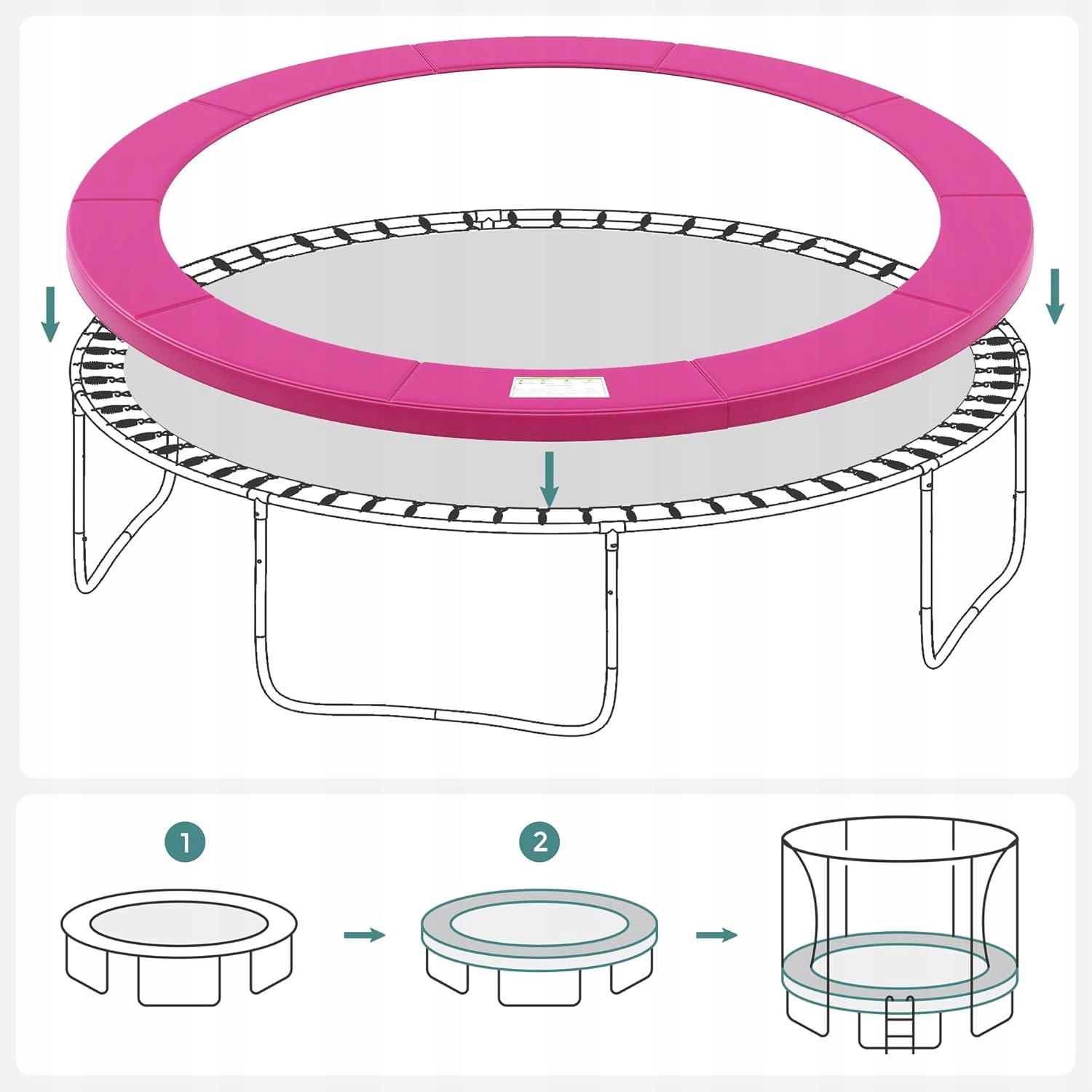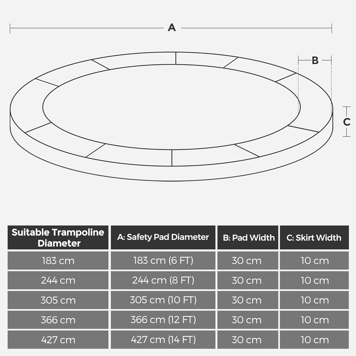 Найдите подходящую защиту для правого края. Эта защита для края стандартного размера 244 см (внешний диаметр: 244 см, внутренний диаметр: 184 см) шириной 30 см и толщиной 1,5 см подходит для большинства круглых батутов того же размера.