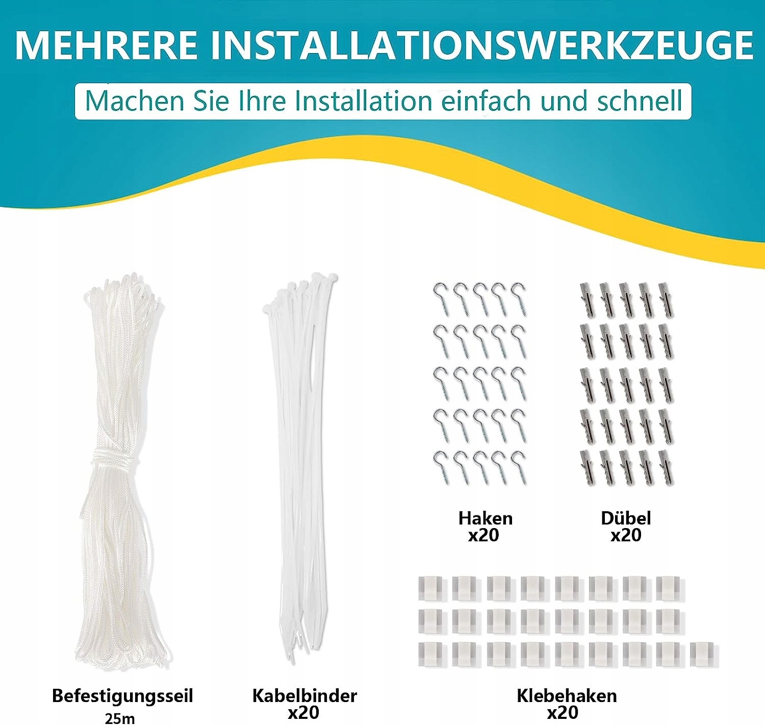Обширный комплект упрощает и ускоряет установку. В комплект входит подробная инструкция (может быть недоступна на польском языке), защитная сетка для кошек, крепежная веревка длиной 25 м, 20 самоклеящихся крючков, 20 кабельных стяжек, 20 крючков и 20 колышков.