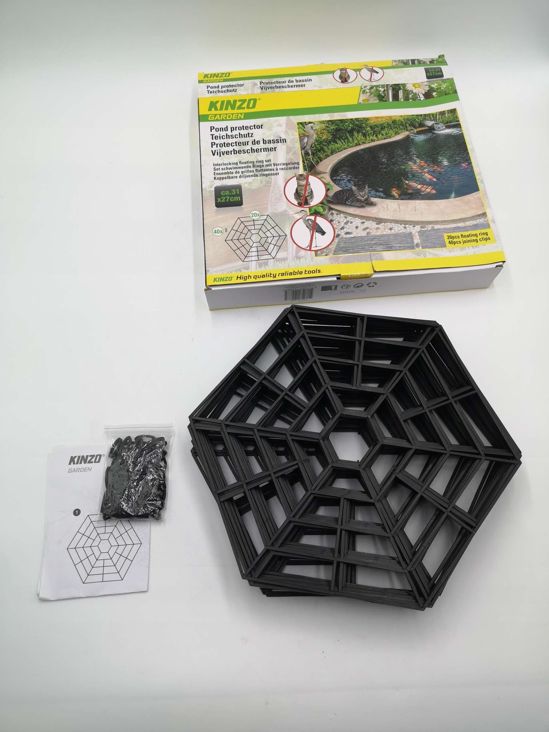 - Жесткие диски Pond Defender можно легко зафиксировать с помощью прилагаемых зажимов, а жесткие диски можно легко снять для чистки и обслуживания пруда. Ромбовидная сетка не позволяет летающим птицам ловить рыбу в пруду, который легок, удобен и красив.