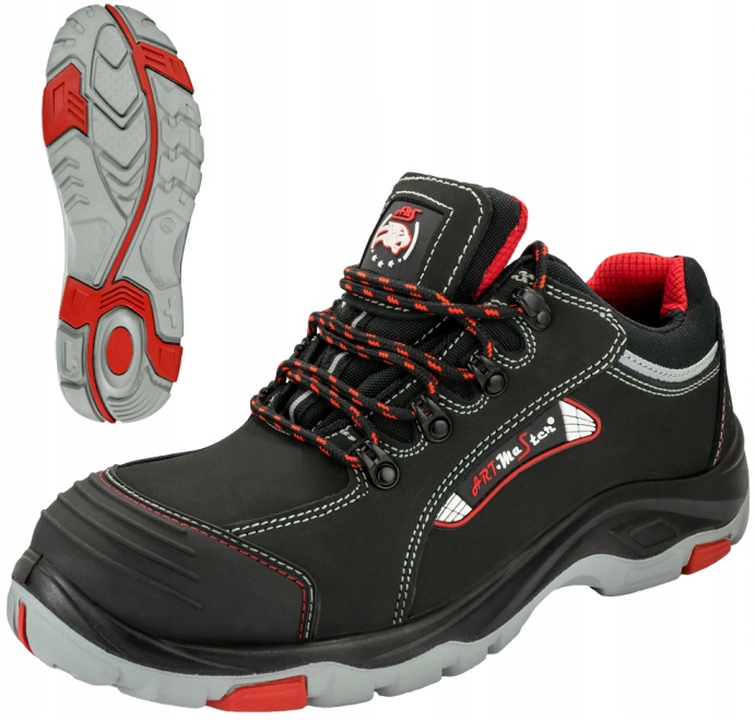 - Верх выполнен из черного нубука, оснащен светоотражающими элементами и фурнитурой красного и белого цвета, повышающей визуальную привлекательность обуви,