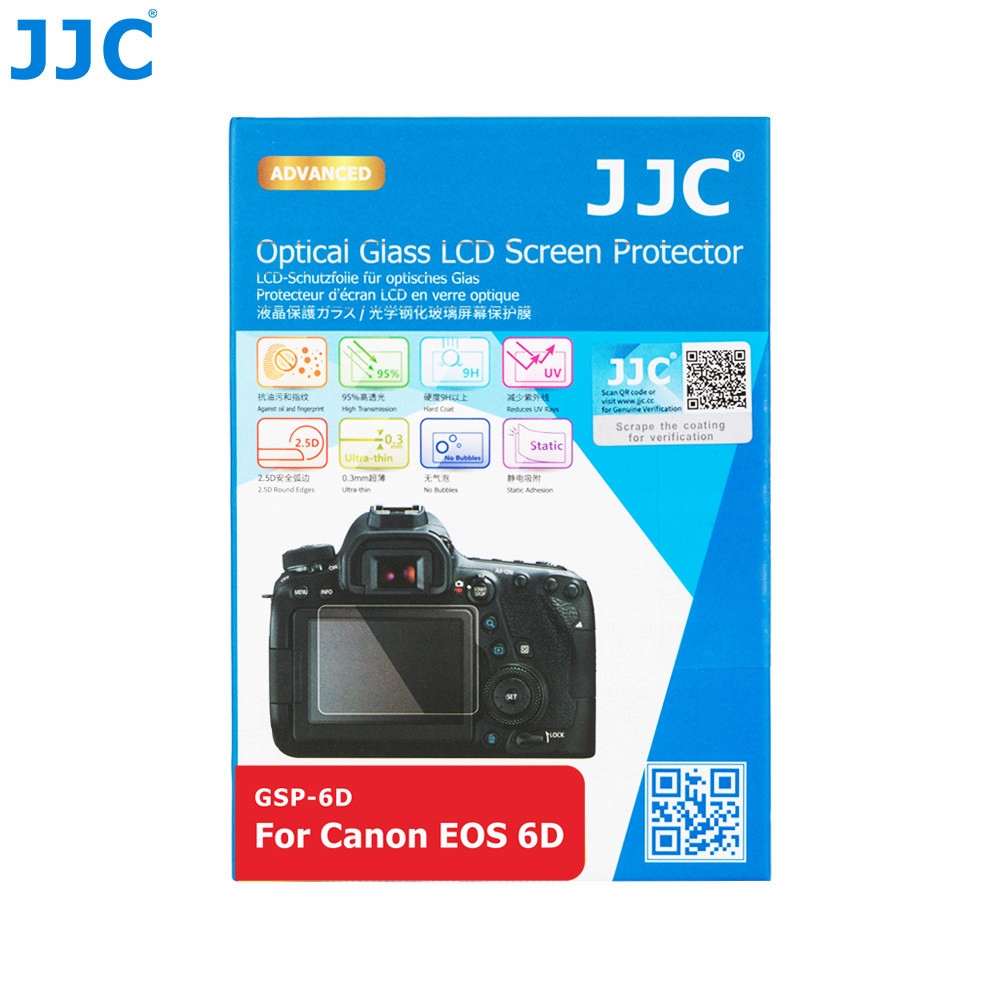 Защитное стекло серии JJC GSP представляет собой ультратонкое оптическое стекло толщиной 0,01 дюйма, которое используется для защиты ЖК-дисплея камеры. Высокий коэффициент пропускания 95 % обеспечивает четкое отображение изображения на ЖК-дисплее. Твердость поверхности 9H и несколько слоев защитного материала защищают экран от грязи, царапин, пота, пятен и ударов света. Небьющееся стекло блокирует ультрафиолетовые лучи, пропуская при этом видимый свет. Поверхность защитного стекла также устойчива к воде, маслу и воздействию света. Закругленные края 2,5D обеспечивают очень удобную и гладкую поверхность, которая прилипает во время установки и предотвращает появление царапин на краях пальцами. Защитное стекло легко устанавливается, не захватывая пузырьки воздуха, а также легко удаляется чистящая ткань из микрофибры и пылепоглотитель для легкой очистки. Защитная пленка также поставляется с парой защитных ПЭТ-пленок для окна камеры, в зависимости от конкретной модели камеры. 0,01 дюйма (0,3 мм) Содержимое упаковки Защитная пленка для стекла x 1 Влажная чистящая ткань x 1 Чистящая ткань из микрофибры x 1 Пылепоглотитель x 1 Защитная пленка из полиэтилентерефталата для подэкрана x 2 (в зависимости от конкретного типа камеры, для камер с двойным экраном и тремя экранами) Особенности продукта Адаптировано для каждого типа экрана Ультратонкое оптическое стекло 0,01 дюйма Высокий коэффициент пропускания до 95% Твердость до 9H Несколько слоев защитного материала Блокирует УФ-излучение, пропуская видимый свет. Защищает от воды, масел и отпечатков пальцев. Легко устанавливается без образования пузырьков воздуха и легко удаляется. Статический клей не оставляет липких следов. 2. Подходит для любого типа экрана. Закругленные края 5D. Бесплатные инструменты для очистки ЖК-экрана перед установкой. Бесплатная защитная пленка из ПЭТ для панели, если камера Модель GSP-6D имеет совместимую марку CANON. Совместимые камеры EOS 6D.