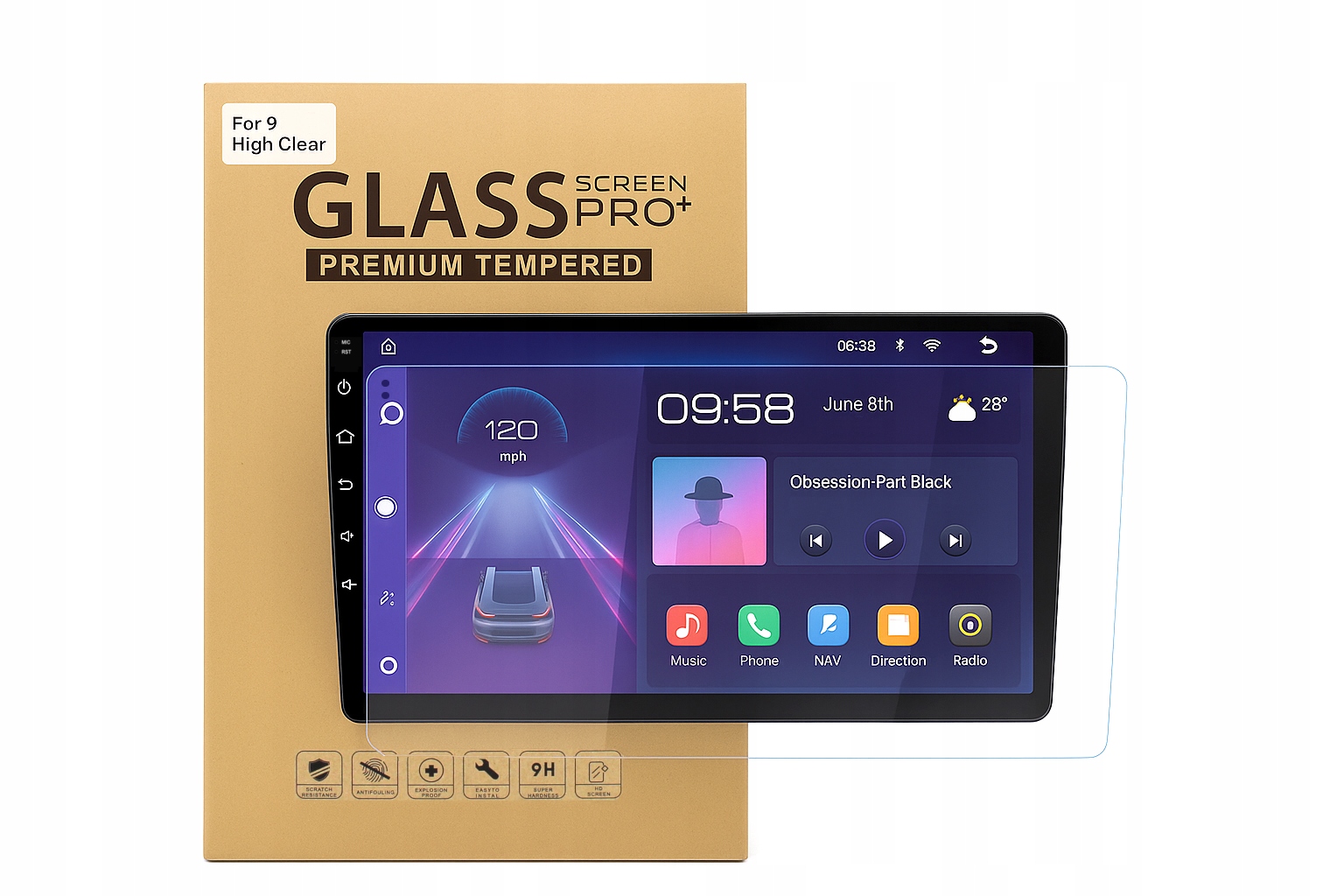 Наша быстрое подходит для навигации 9-дюймового с размерами: 227 (вверху) мм x 127 мм (ширина) и 216 мм (внизу) .. У нас также есть стекло для 10 дюймов . Вал имеет специально вырезанные отверстия - микрофон и кнопка .