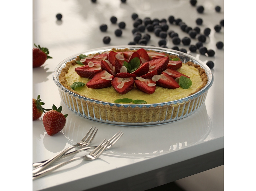 Тепло -резистентная пирог, изготовленная из закаленного стекла. Этот тип стекла гораздо более устойчив к царапинам и ушибам, чем продукты из фарфора и фарфора. Он имеет идеальную гладкую поверхность, которая способствует тщательной промывке и сушке. Благодаря этому микроорганизмы и бактерии не оседают на поверхности.