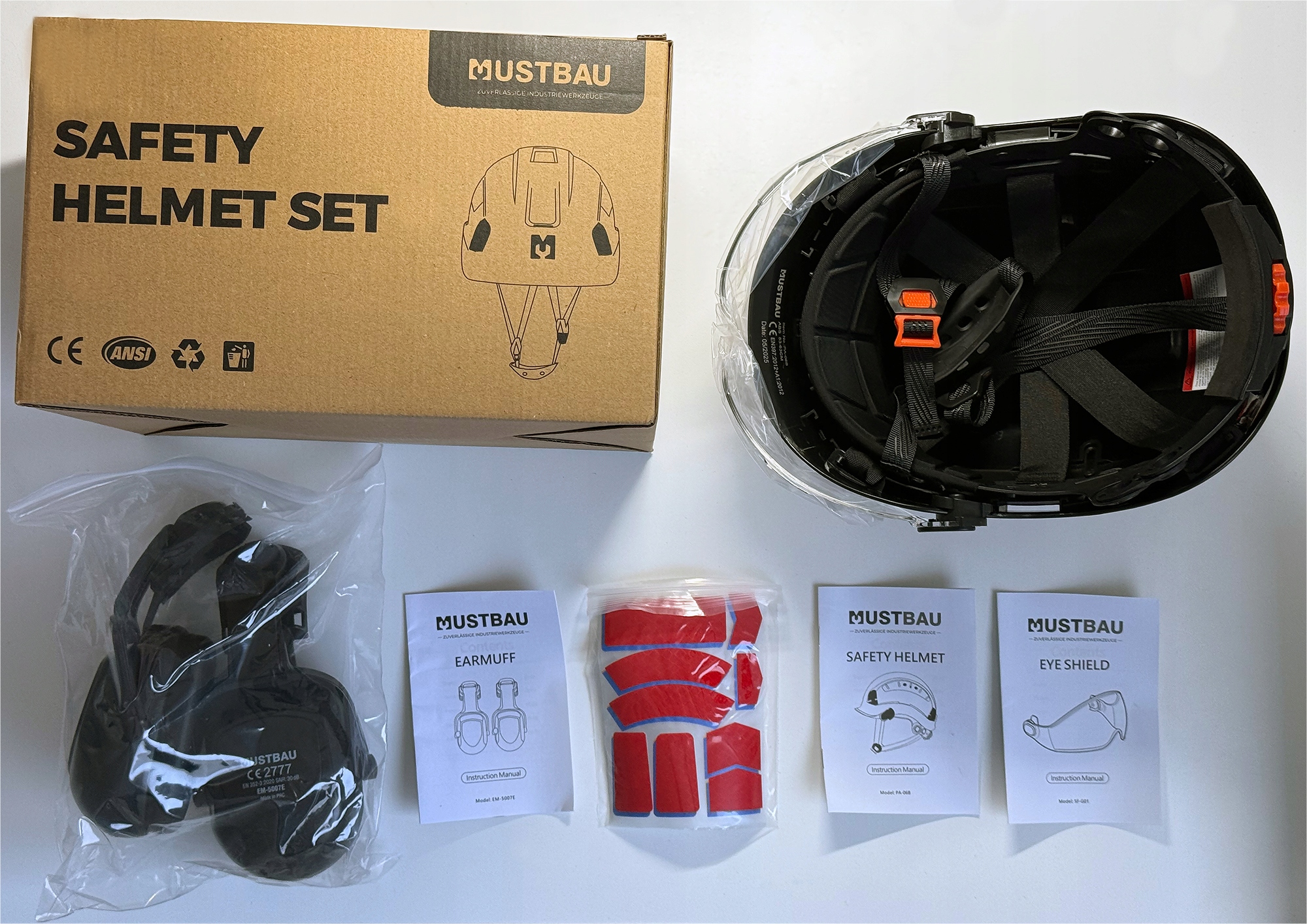 MUSTBAU PA-HSE90011B - Профессиональный защитный, рабочий, строительный шлем OHS EN397 с наушниками 30 дБ и очками, 6-точечный ремень безопасности, регулируемый размер 53-63 см