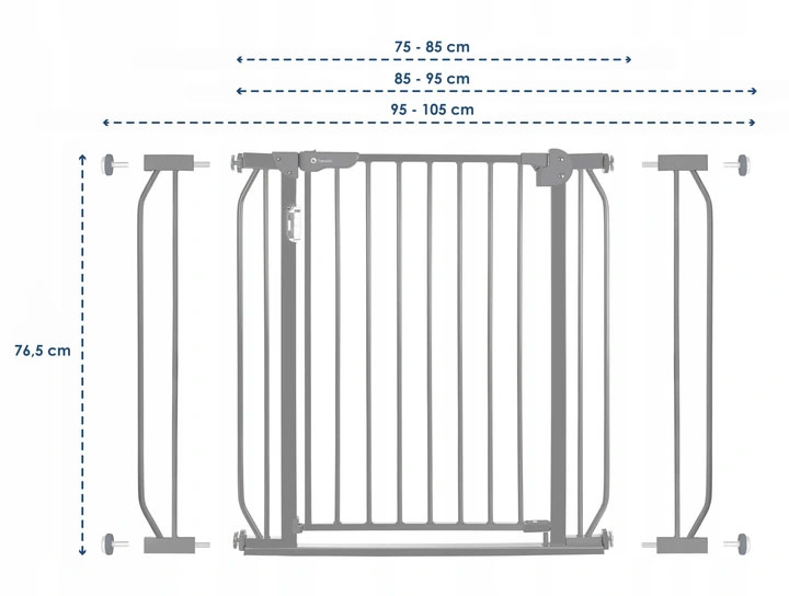 Узел затвора с винтами гарантирует полную стабильность продукта. Вы можете быть уверены, что малыш не будет демонтировать барьер. Специальное наложение позволяет вам расширить барьер до 105 см. После добавления дополнительного расширения ворота также можно использовать для защиты лестницы.