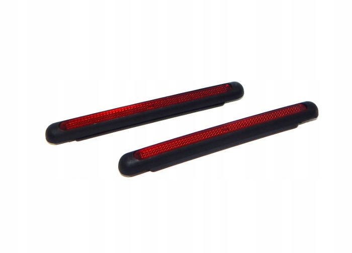 Размеры каждого бампера составляют примерно 136 x 14 x 11 (длина x ширина x толщина). На фото вид на бампер с двух сторон - красный отражатель и сторона с креплением с другой. Крепится к краю двери нажатием.