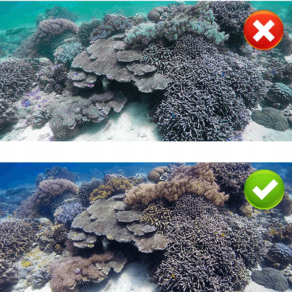 🔴 - Ярко-красный фильтр можно корректировать для синей воды и тропической морской воды, подходит для погружений на глубину от 3 до 30 метров и дополняет красный цвет, поглощаемый морской водой, эффективно предотвращая появление зеленого или синего цвета изображения;