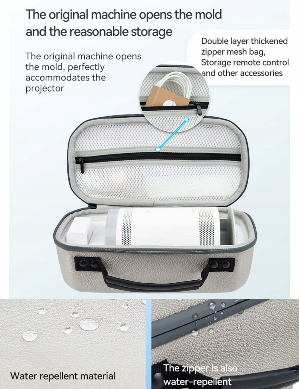✔ Имеются внутренние отсеки, предназначенные для отдельного хранения проектора и зарядной головки, что выглядит аккуратно и аккуратно. а также сетку для размещения мелких аксессуаров с функцией сброса давления и ударопрочностью для лучшей защиты проектора.