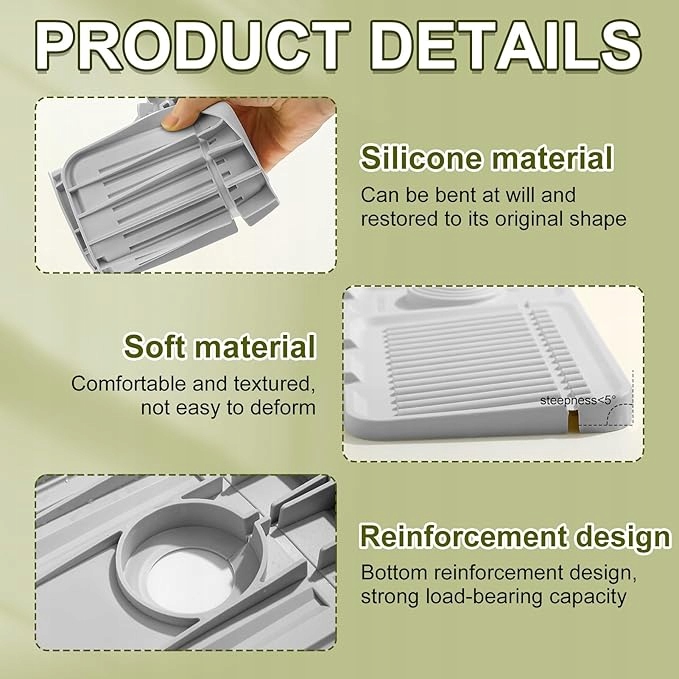 Наш капельный коврик изготовлен из высококачественного силиконового материала, благодаря которому он имеет не -скользящую поверхность, которая обеспечивает безопасность и стабильность крана. Вам больше не нужно беспокоиться о том, что посуда или стаканы упадут при напряжении воды