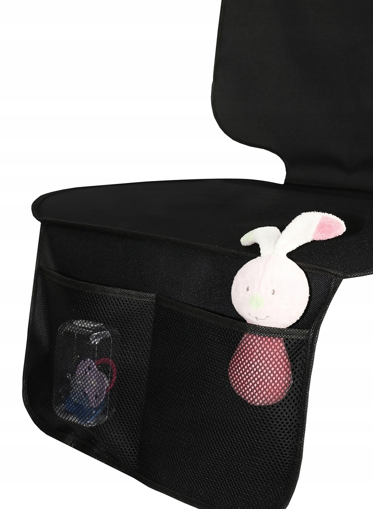 Сиденье дополнительно обложено плотным полиэстером, который является водонепроницаемым слоем. Защитный коврик прост в установке – достаточно разложить его на сиденье и прикрепить к подголовнику с помощью эластичной ленты, пришитой к верхней части спинки. Два кармана, расположенные в нижней части коврика, позволят хранить необходимые вещи.