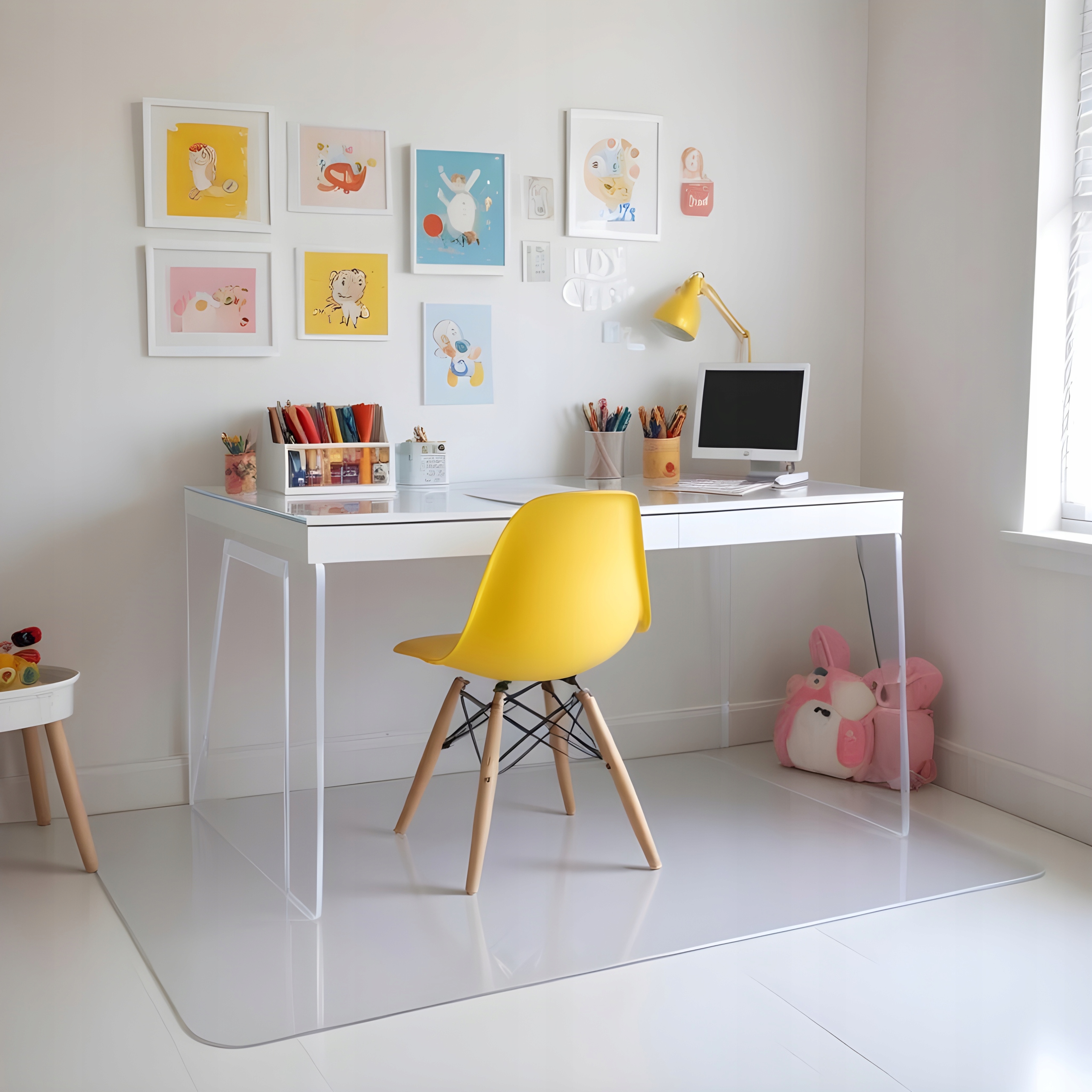 - Универсальность: идеально подходит для всех типов поверхностей — дерева, ламината, плитки, ковры. Он эффективно защищает поверхность от колес вращающегося стула, а также подходит в качестве защиты столешницы или стола.