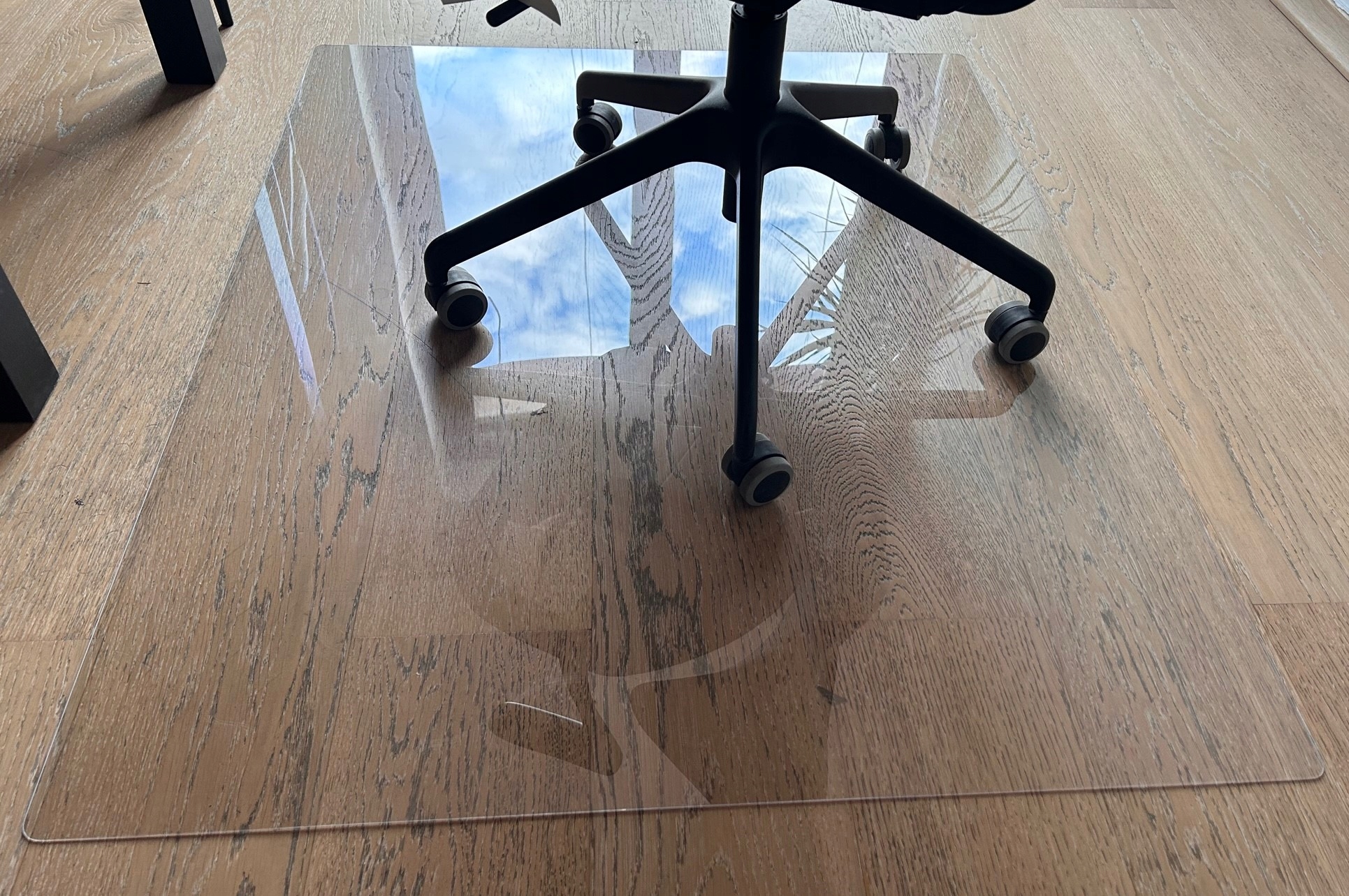 Характеристики: сплошной прозрачный поликарбонат толщиной 1 мм (эффект стеклопакета), 140х120 см, дополнительные наклейки/двусторонний скотч в виде кругов 5 см, если хотите разместить коврик стационарно, закругленные углы 1,5 см как на фотографиях