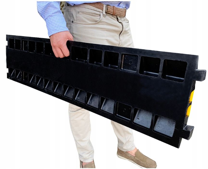 Толстые стенки из закаленной резины и устойчивая форма обеспечивают долговечность и устойчивость к нагрузке до 5 тонн на ось. Противоскользящая поверхность и желтый и черный цвета гарантируют хорошую видимость даже в самых сложных условиях.